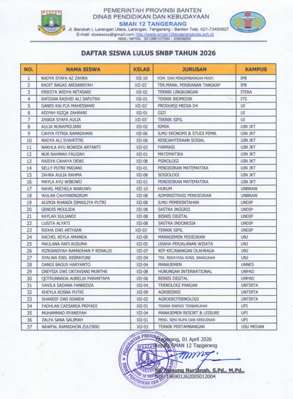 Daftar Siswa Lulus SNBP 2026 SMAN12 TANGERANG